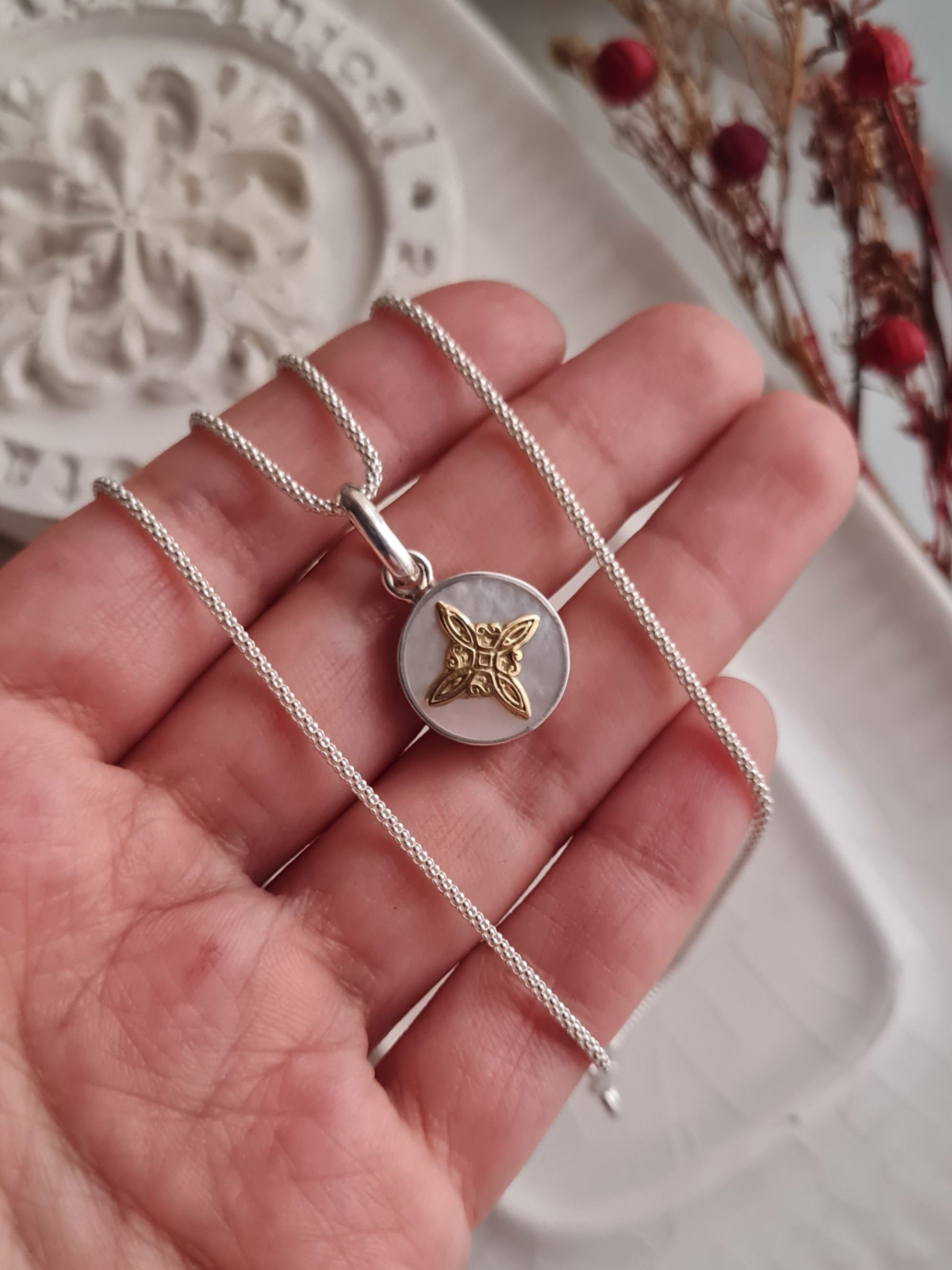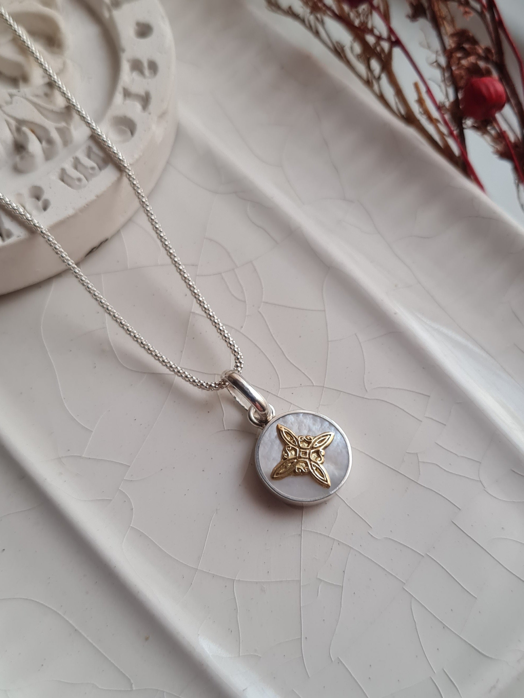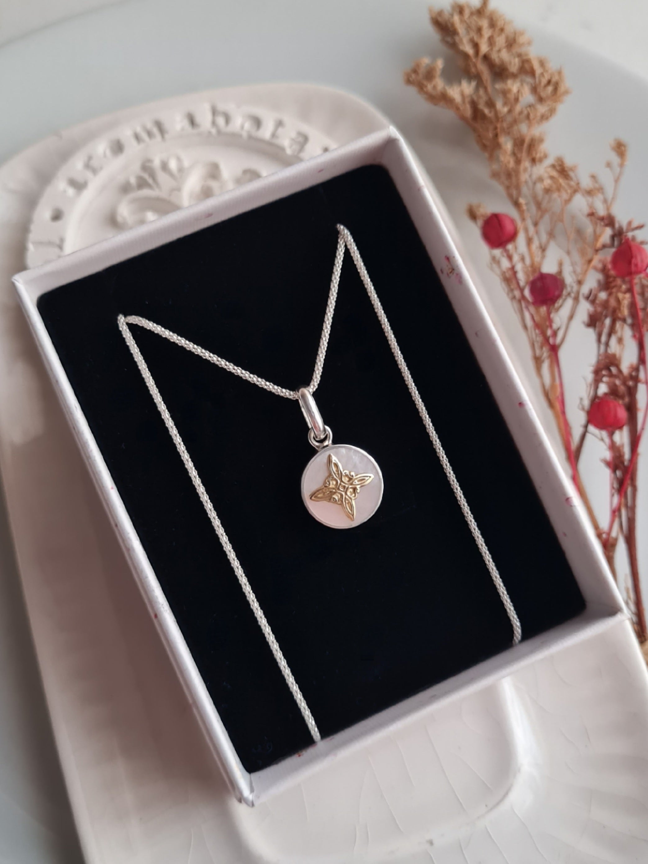 Cadena Pop Corn con dije Encajonado de Plata 950 con fondo de Nácar e imagen en lámina de Oro 18k.