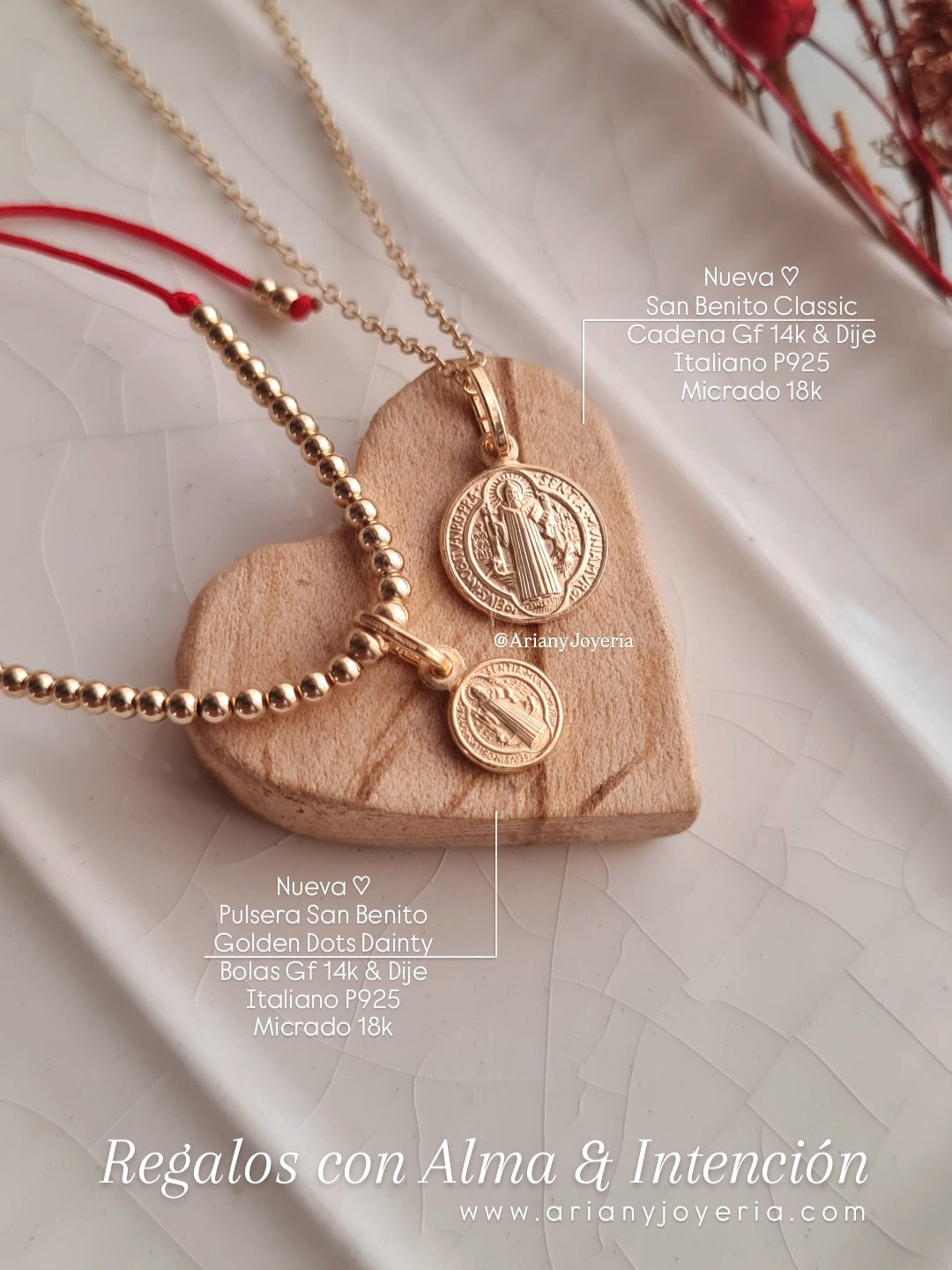 Pulsera regulable bolas 2.5mm GF 14k + Dije San Benito Italiano 8mm P925 Micrado en Oro 18k