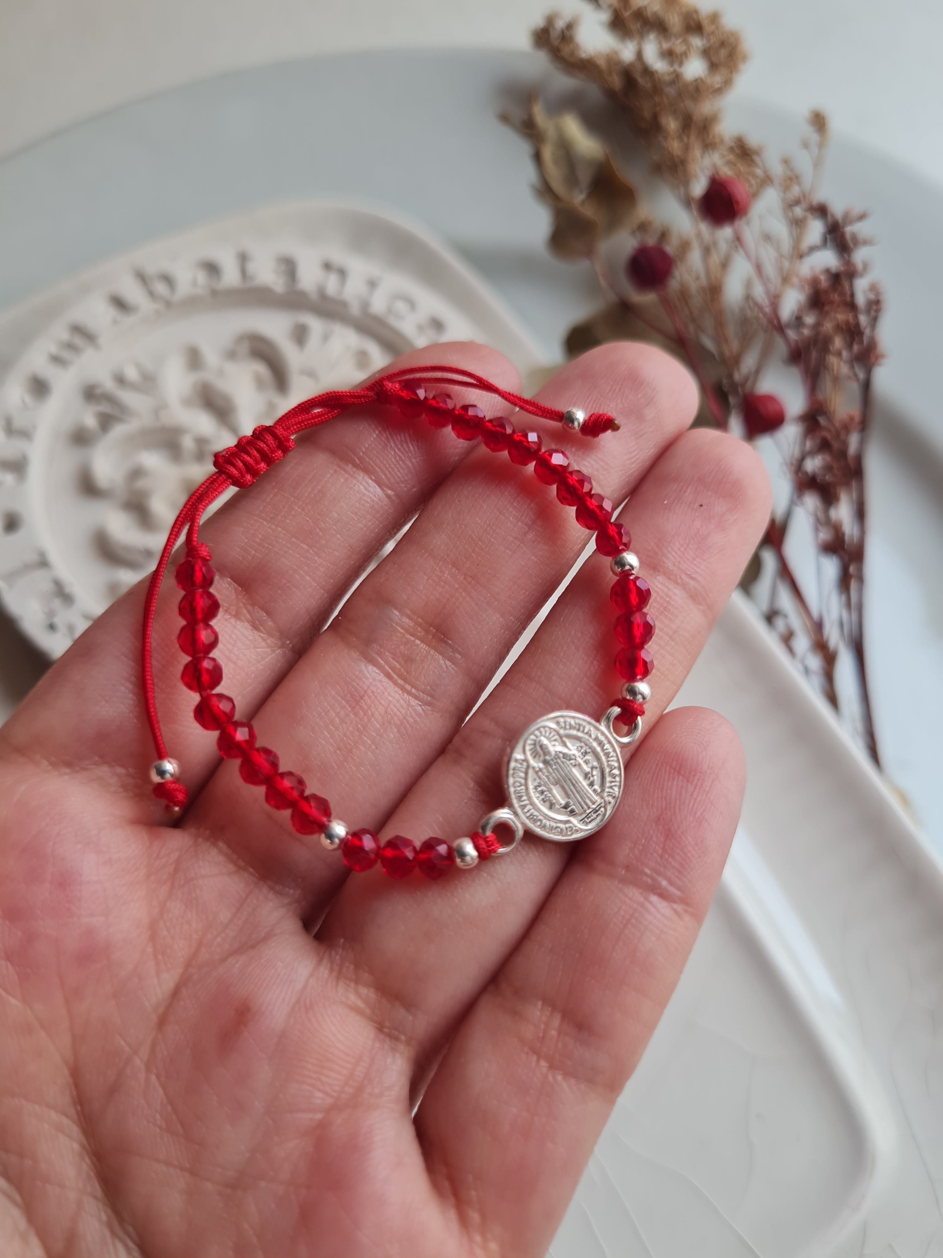 Pulsera regulable tejida de hilo rojo con bolas muranos y dije de San Benito en plata 950.- Puede usarse en bebes, niños y adultos