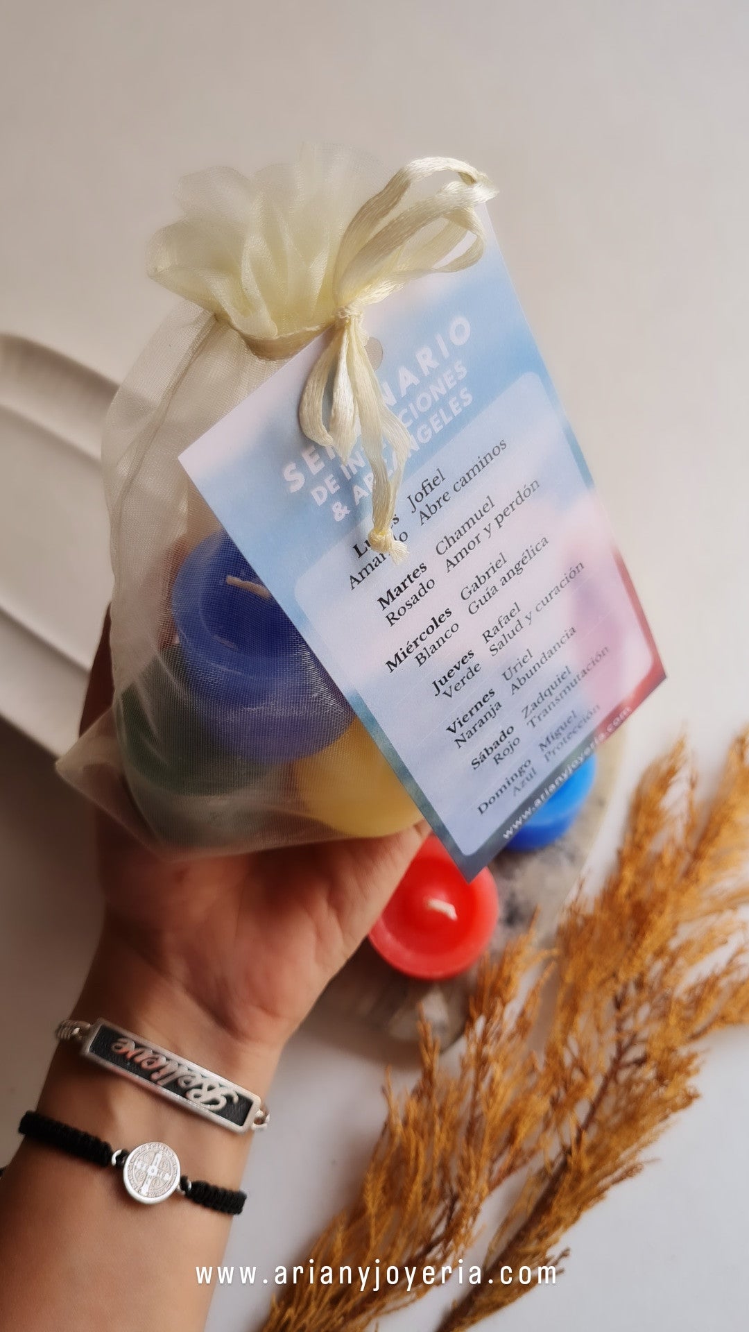 7 Velas dentro de una bolsa de Organza y una tarjeta para que sepas que día de la semana prender cada color.
